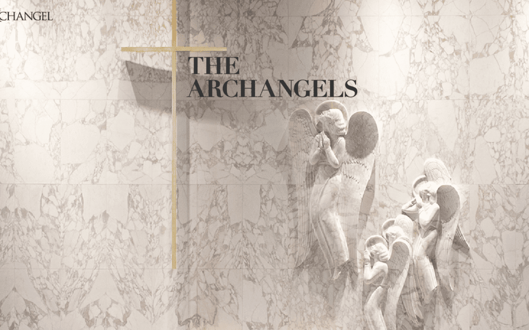 In 1961, the monumental marble reredos behind the altar at Saint Michael and All Angels was installed, revealing angels close to the altar worshipping with us. Embedded within the 35-foot tall reredos is the 15-foot-high bas-relief sculpture of The Archangels by sculptor Charles Umlauf (1910–1994). The flitch-matched Italian Cremo marble creates patterns of angels’ wings that appear as the Heavenly Host around their leader, Michael, and three of the archangels: Gabriel, Raphael, and Uriel, with their worshipful attention directed towards the large gold leaf cross. Archangels are one of the Nine Choirs of Angels, which represent how Angels participate in God’s mission to humanity as guides, protectors, and who worship alongside humankind.